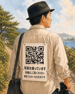 話しかける勇気の代わりに、背中に編んだQRコードを下げる。