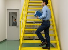 オフィス併設倉庫をつなぐ高視認イエロー鉄骨階段